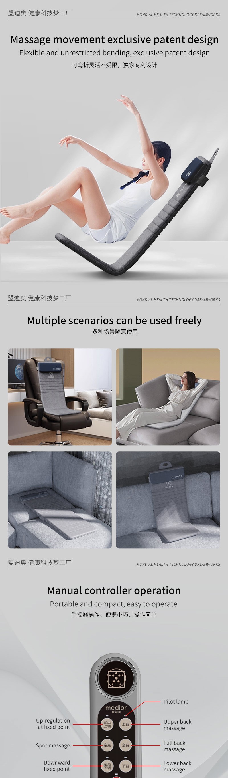1、L型機(jī)芯結(jié)構(gòu),對(duì)折包裝縮小體積2、獨(dú)家專利柔性機(jī)芯3、力度三檔調(diào)節(jié),定點(diǎn)按摩,腰背按摩、臀腿按摩、全背按摩模式選擇4、背部行走揉捏,按摩區(qū)域加長(zhǎng)到從肩膀到大腿;5、更加貼合不同款式的椅子整體可對(duì)折收納