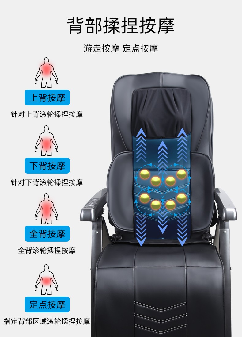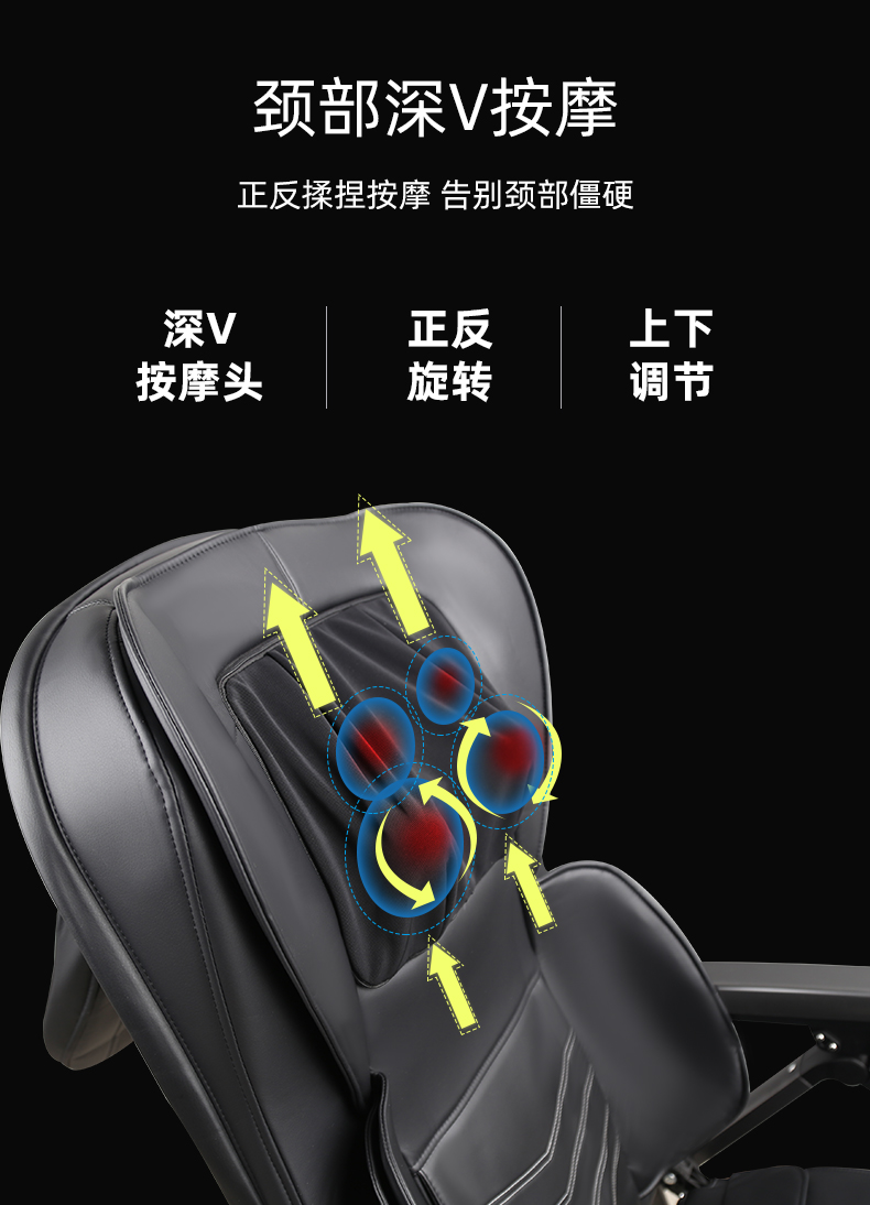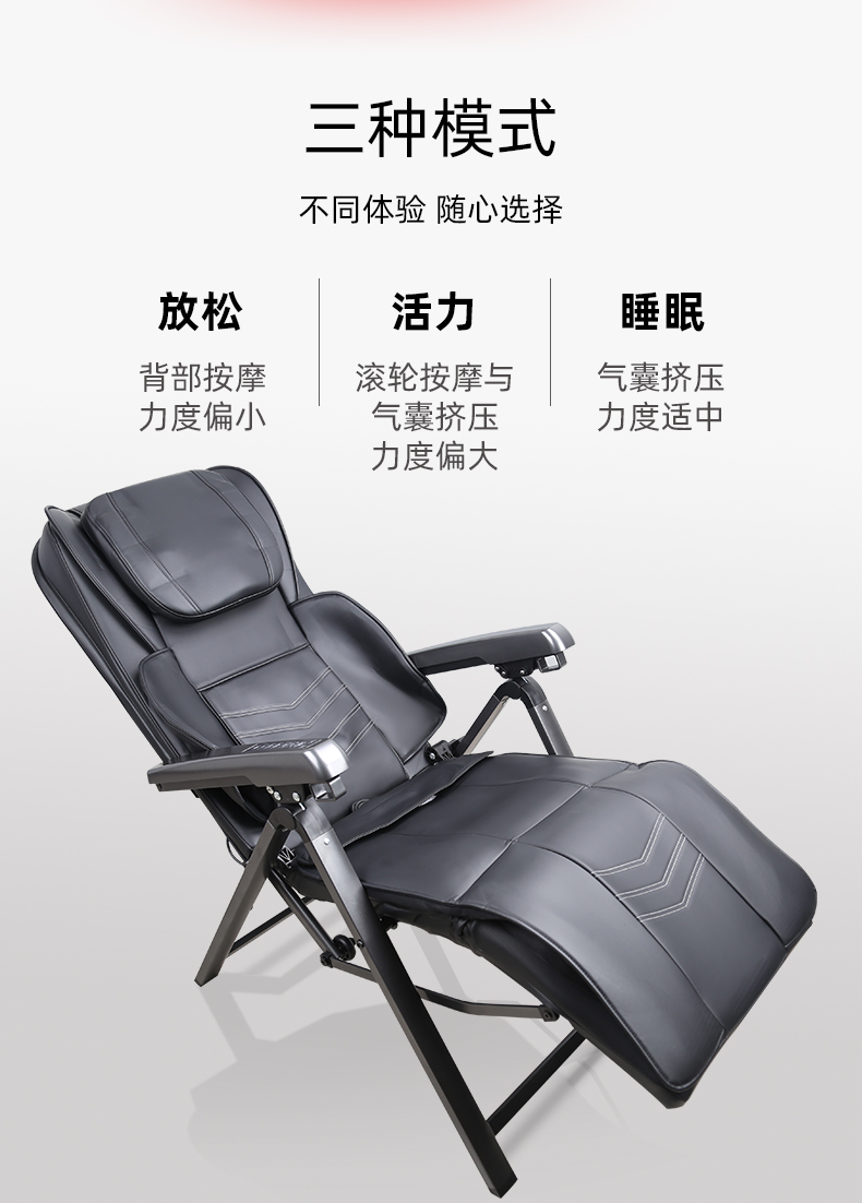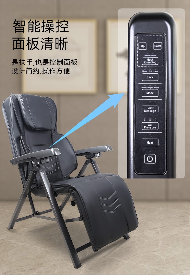 折疊式按摩椅1.頸部:創(chuàng)新壓肩按摩,正反轉(zhuǎn)揉捏,上下可調(diào)節(jié)高矮適應不同人。