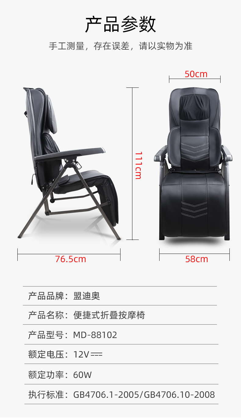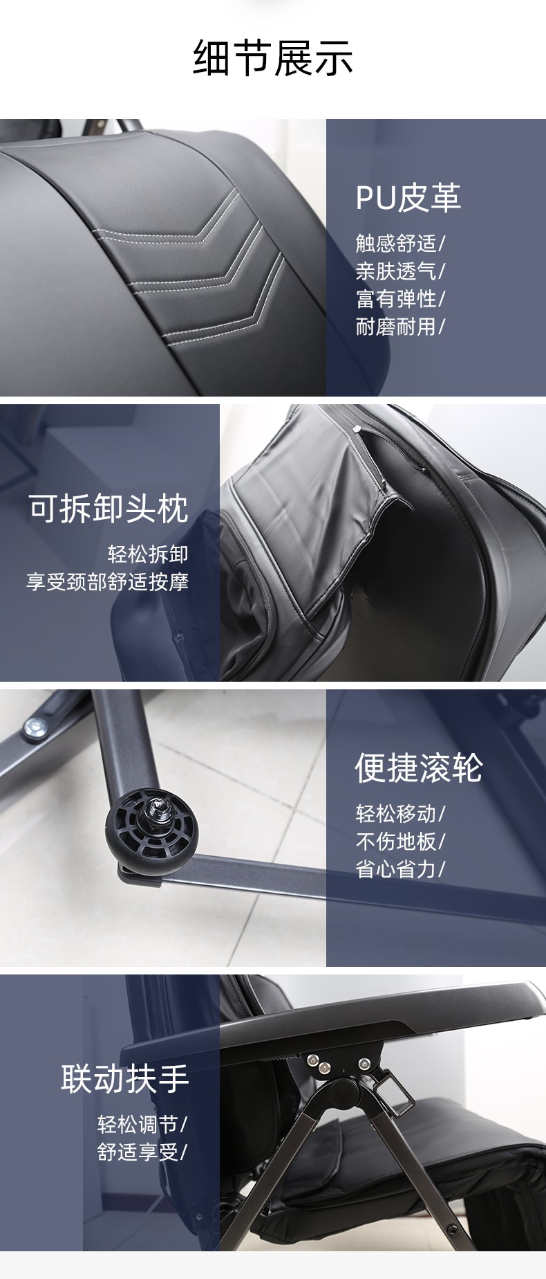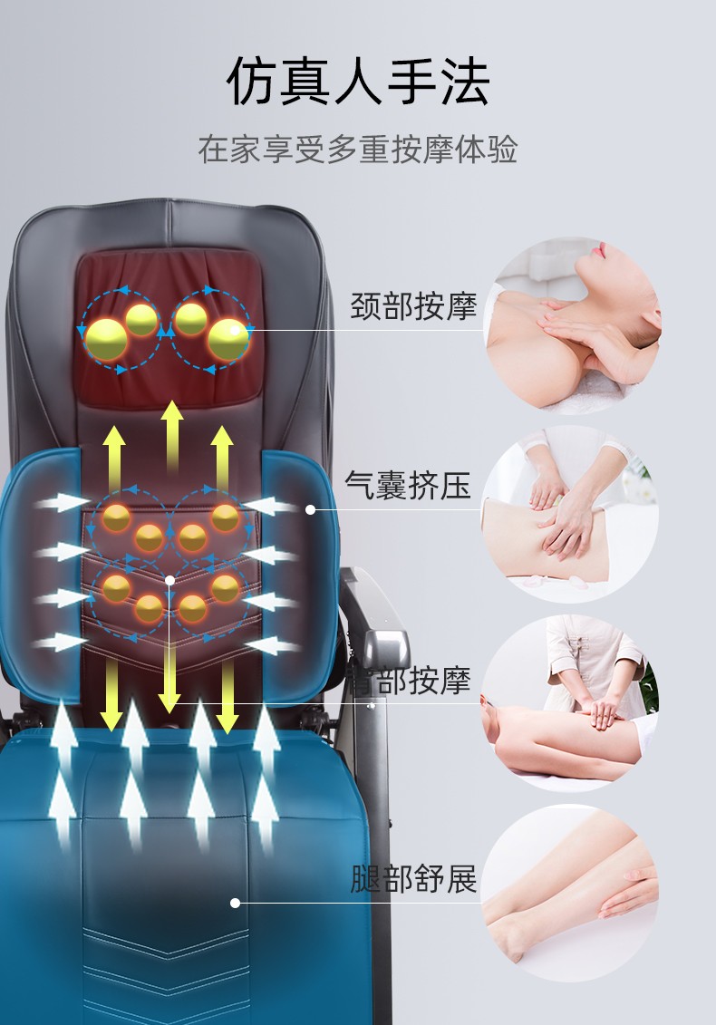 折疊式按摩椅1.頸部:創(chuàng)新壓肩按摩,正反轉(zhuǎn)揉捏,上下可調(diào)節(jié)高矮適應不同人。