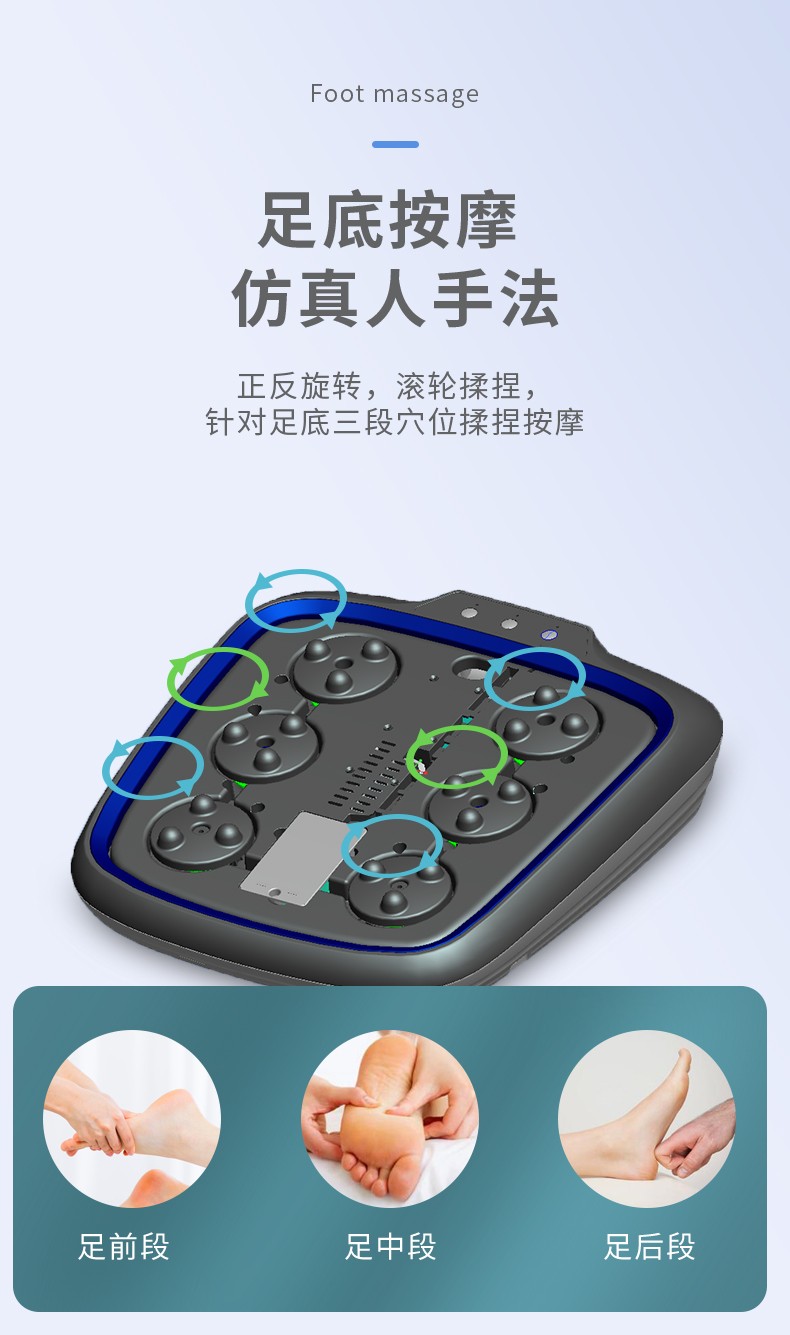 功能特征:腳底六個(gè)按摩頭,三檔力度調(diào)節(jié),按摩頭正反轉(zhuǎn),